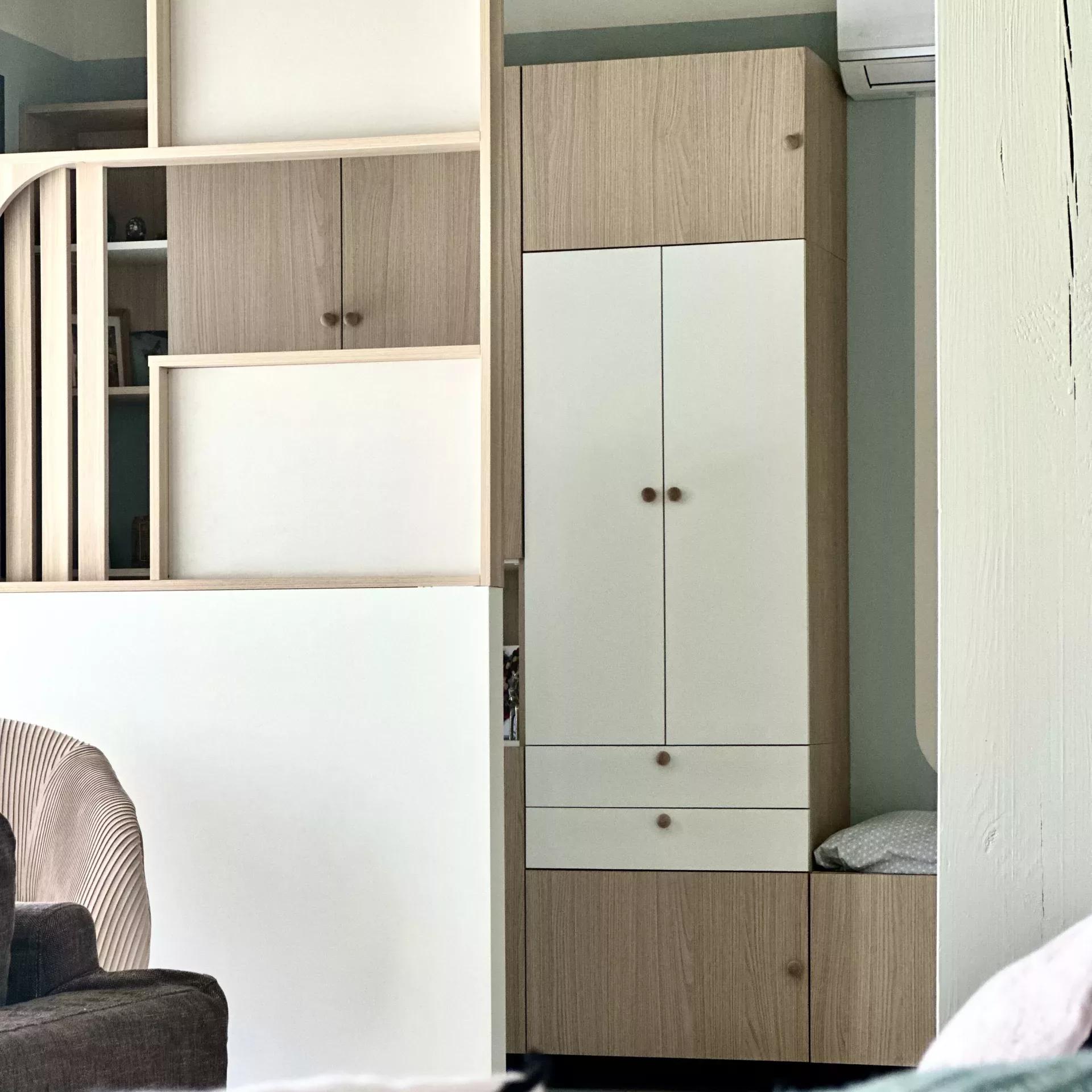 La transformation est totale. La pièce s’ouvre aujourd’hui pleinement sur l’extérieur grâce à une large baie vitrée qui remplace les anciennes portes-fenêtres : lumière traversante et effet dedans-dehors immédiat. Nous avons pensé et créé une entrée fonctionnelle répondant aux besoins de chacun, équipée de meubles de rangement sur mesure et d’un claustra pour délimiter cet espace du reste de la maison sans le cloisonner, qui donne le ton dès l’arrivée.