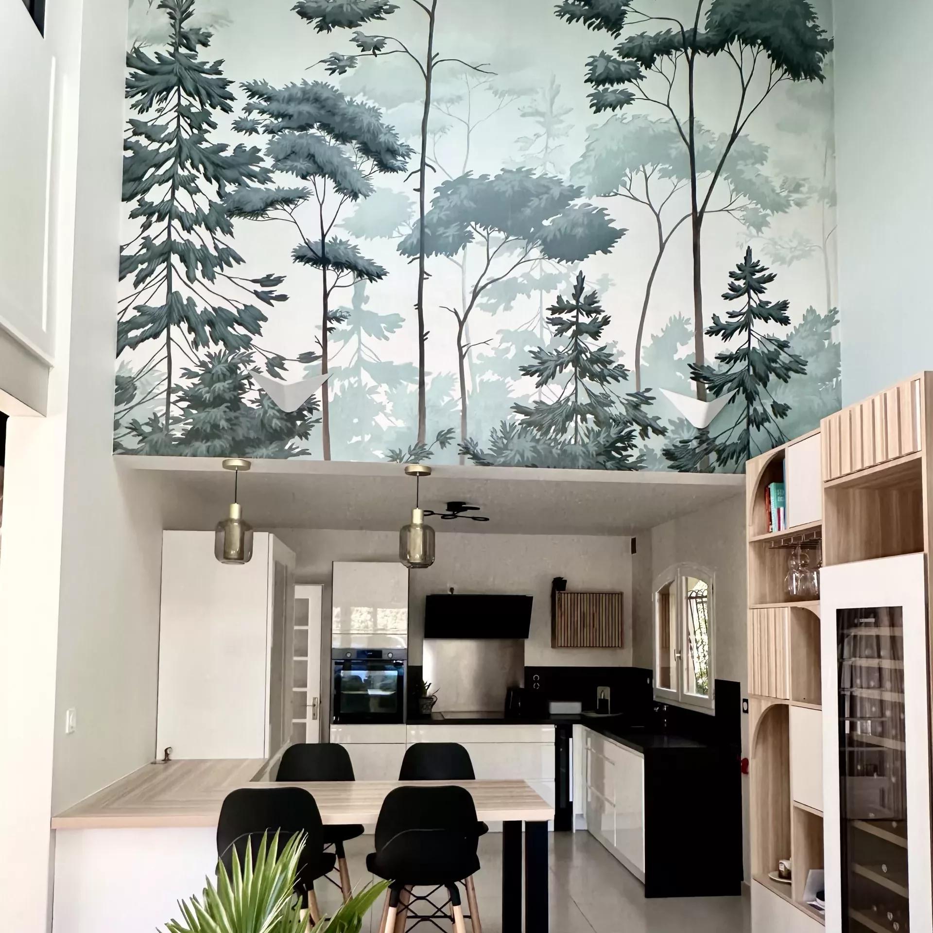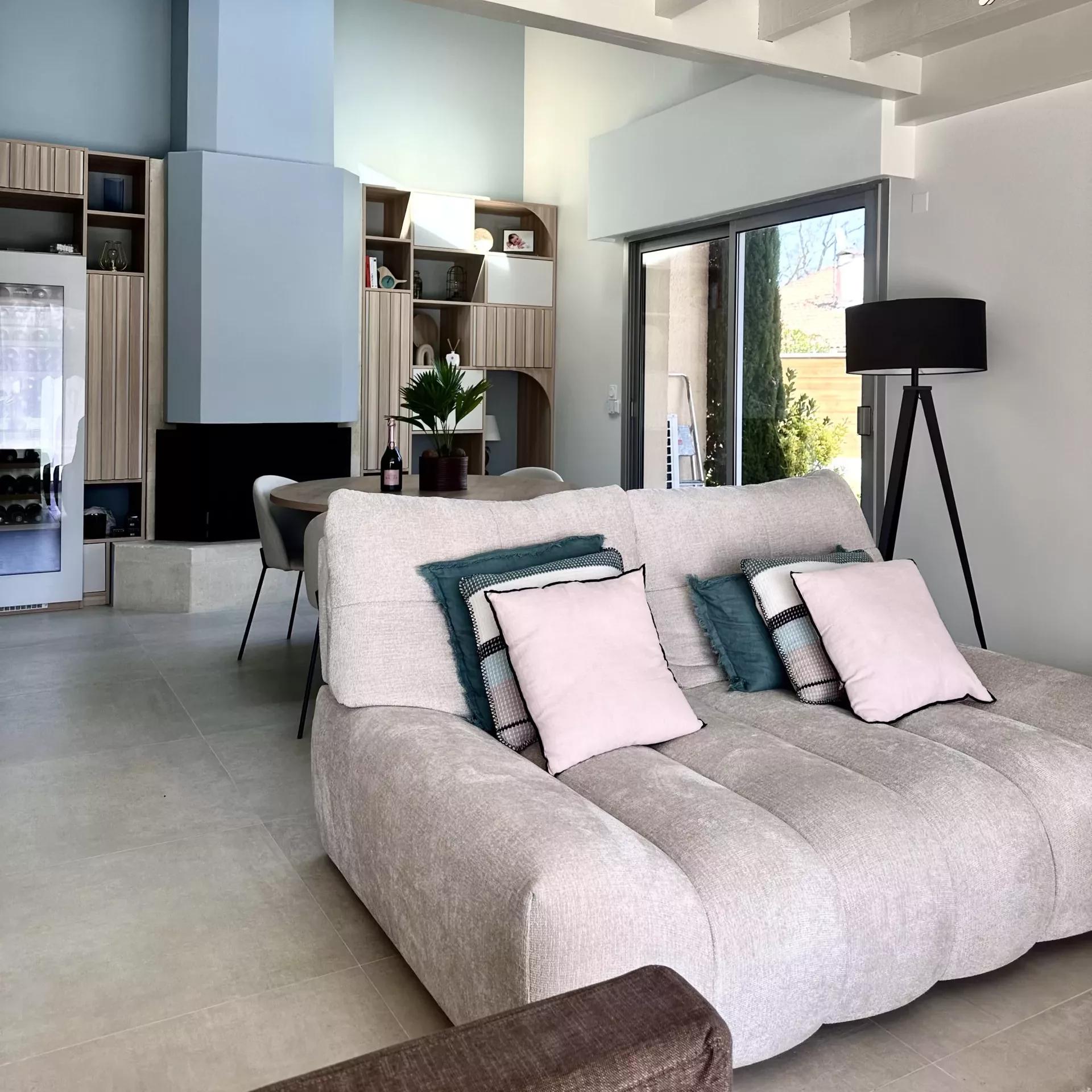 La cheminée, totalement repensée, a été modernisée grâce à un meuble sur-mesure alliant niches, rangements fermés et cave à vin, devenant un véritable élément de caractère. L’ensemble a été habillé d’une palette douce (beige, lin, bleu pastel, touches végétales) pour une atmosphère contemporaine, chaleureuse et cohérente, jusque dans le choix du mobilier et des luminaires.